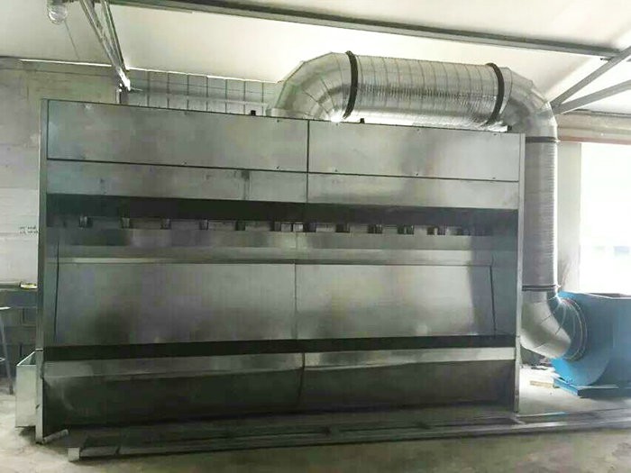 無泵水幕噴漆室在含有漆霧的空氣經過前麵水幕後進行一次攔截,隨即進入“沸騰攪拌通道”,氣流掠經通道下方的水麵時由於高速作用將水帶起進入通道內,氣流到達通道的上方後由於流速的降低,被帶起的水因為重力的作用會有一部分水落回致通道口下方,這樣就會與繼續帶起的水產生撞擊從而形成沸騰狀,呈沸騰狀的水珠與氣流充分混合攪拌後,顆粒物將被清洗到水中,從而達到對漆霧顆粒清洗淨化的目的。而被提起的水其中一部分跟隨氣流組織進入集氣箱,經過分流格柵將空氣與水分離,分離後的淨化空氣由排風機排向室外,分離後的水則沉積在集氣箱底部,匯集到溢水槽後溢流到水幕板上形成循環水幕,從而有效地除去空氣中的漆霧顆粒,給操作人員以潔淨的工作環境。