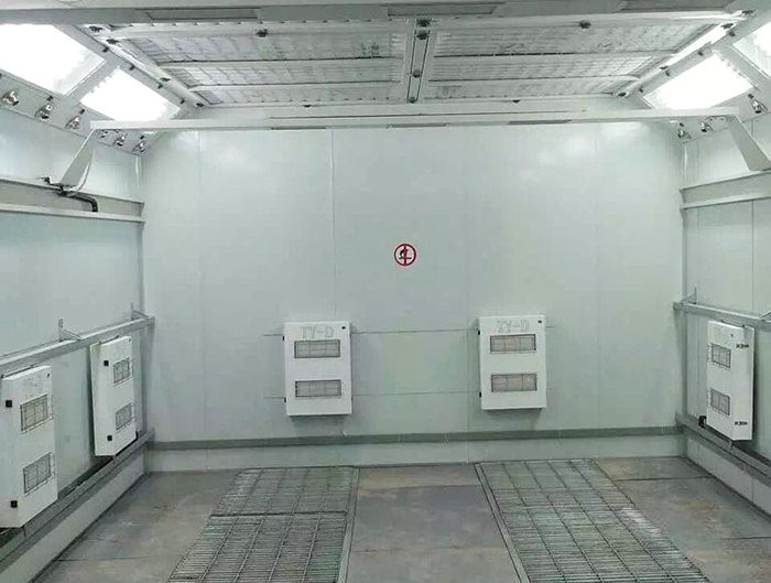 整個噴烤房為拚裝式結構,房體采用子母插式保溫噴塑牆板,密封、保 溫性能好,鋁合金包邊大門,門中間裝有觀察窗,可隨時觀察房內動態;房體側麵裝有工作門,方便工作人員進出,不鏽鋼熱交換器,換熱效率高,使用壽命長;選用進口過濾棉、低噪音高風量風機,確保噴漆效果。噴漆房為工件噴塗提供:(1)潔淨的工作環境;(2)充分收集漆霧。 噴漆房的配置按工件大小、形狀、重量及生產綱領可有多種方式:有開式、閉式之分;有連續式、間歇式之分;有工件自轉或固定之分;有單側噴塗及雙側噴塗之分。近年又發展出油簾噴漆室、下噴漆房等。結構上應包括:送風過濾係統、工件吊掛(輸送、自轉)裝置、水簾係統、水洗係統、排風係統、水槽、照明裝置及室體。 漆霧回收的原理:漆霧回收可分成二個部分:一是噴塗工件時,漆霧與水簾碰撞混合,水簾會溶入部分漆霧落入水槽;二是未溶入水簾的漆霧經水簾板底部縫隙進入水洗室,與霧化噴嘴噴出的水霧充分混合,氣水分離沉降後流入水槽。在水槽中定期加入漆霧凝聚劑形成漆渣。